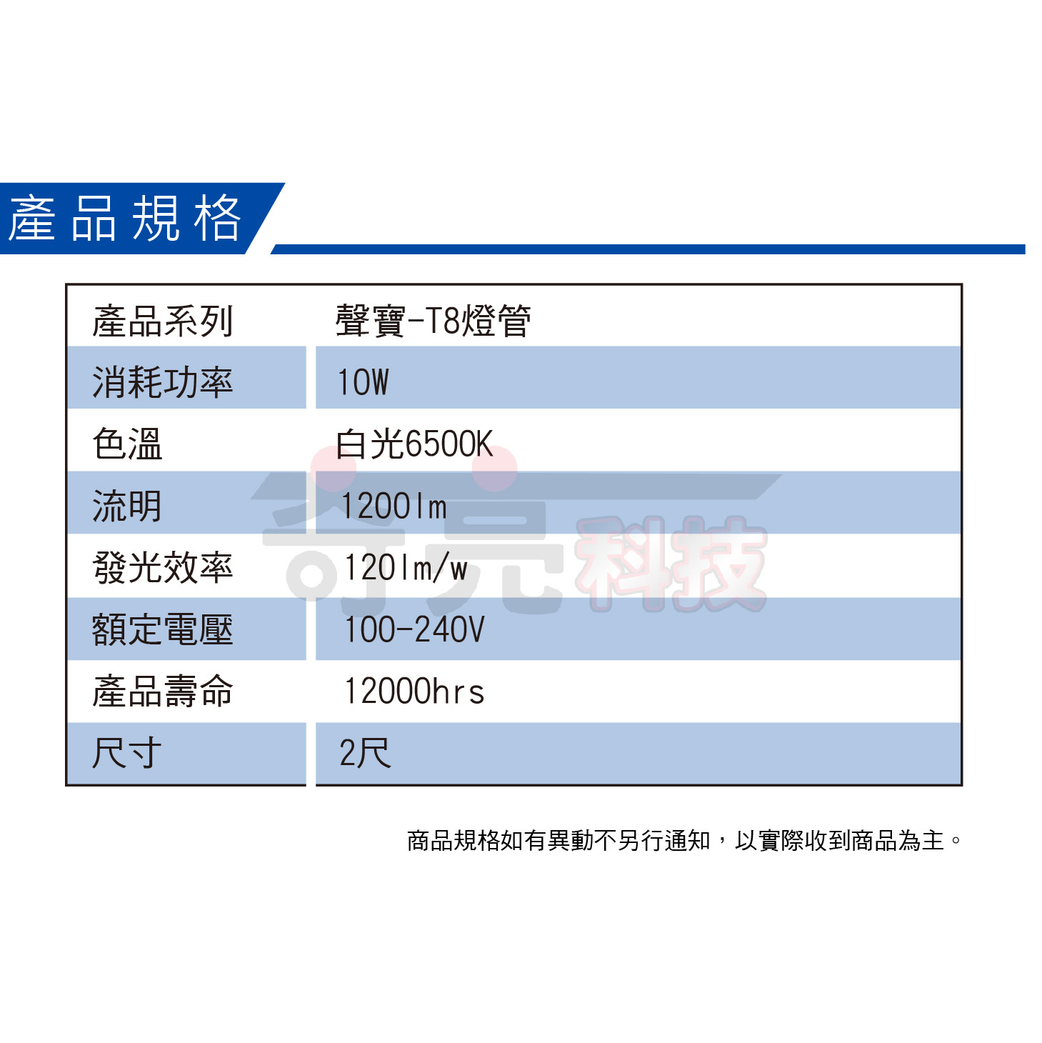 [聲寶 SAMPO] T8 LED 燈管 2尺 10W 燈管 20入