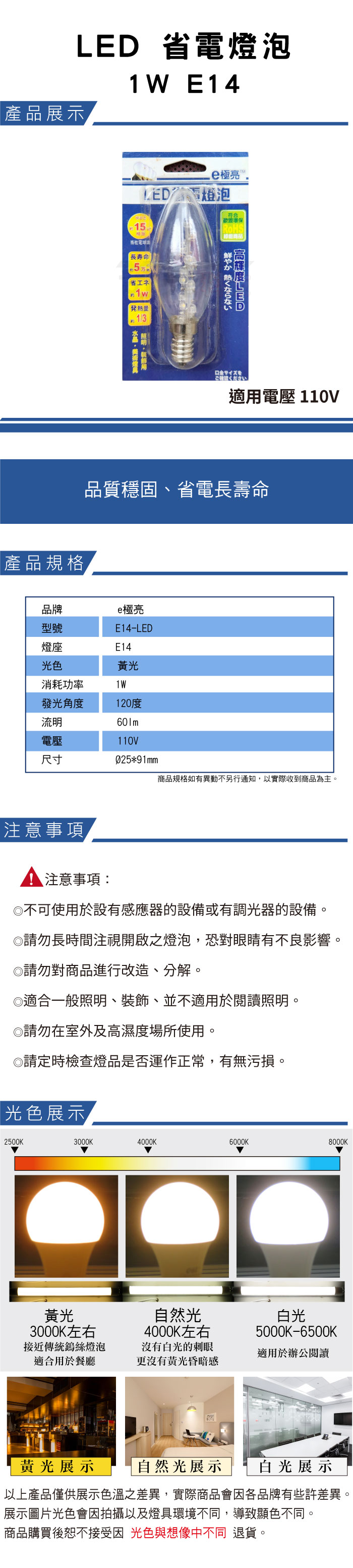 【E極亮】 LED 尖清 LED燈泡 1W 110V E14 黃光 蠟燭燈 水晶吊燈 用光源 含稅