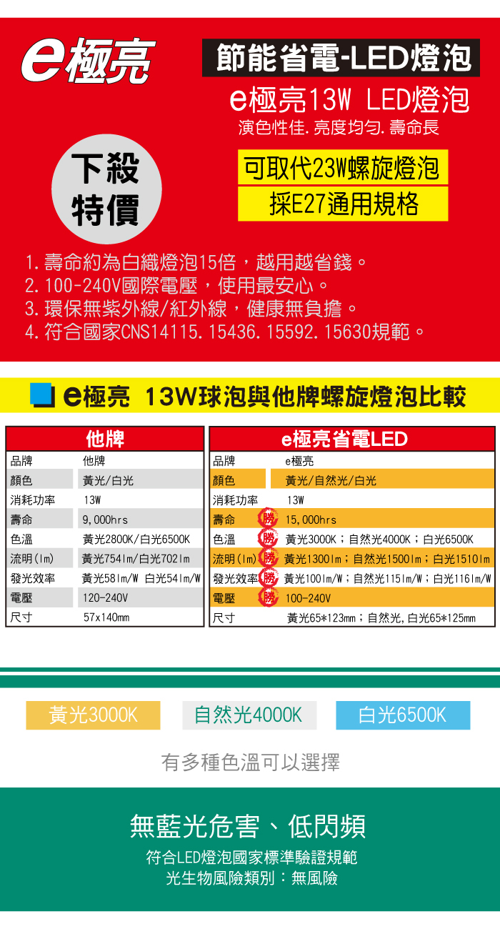 【E極亮】E27 13W 球泡 全電壓X24入(企業)